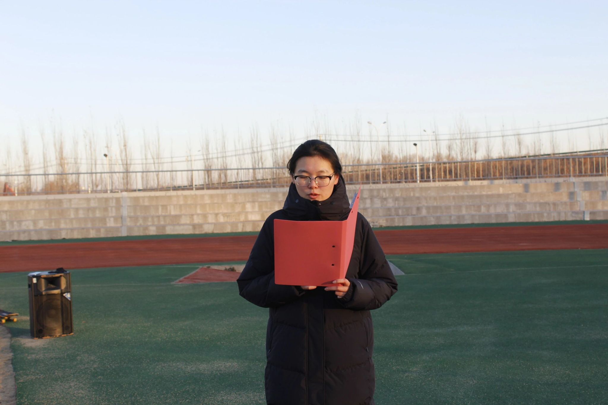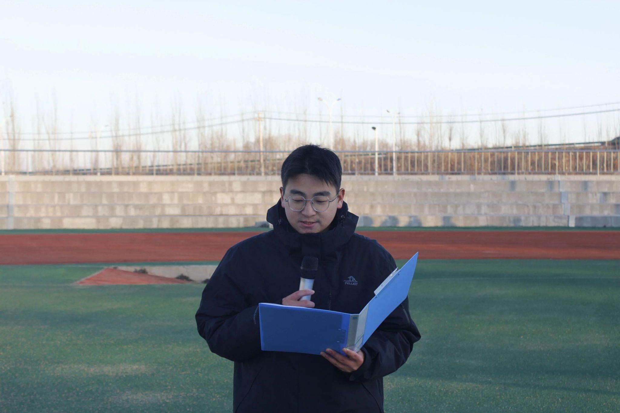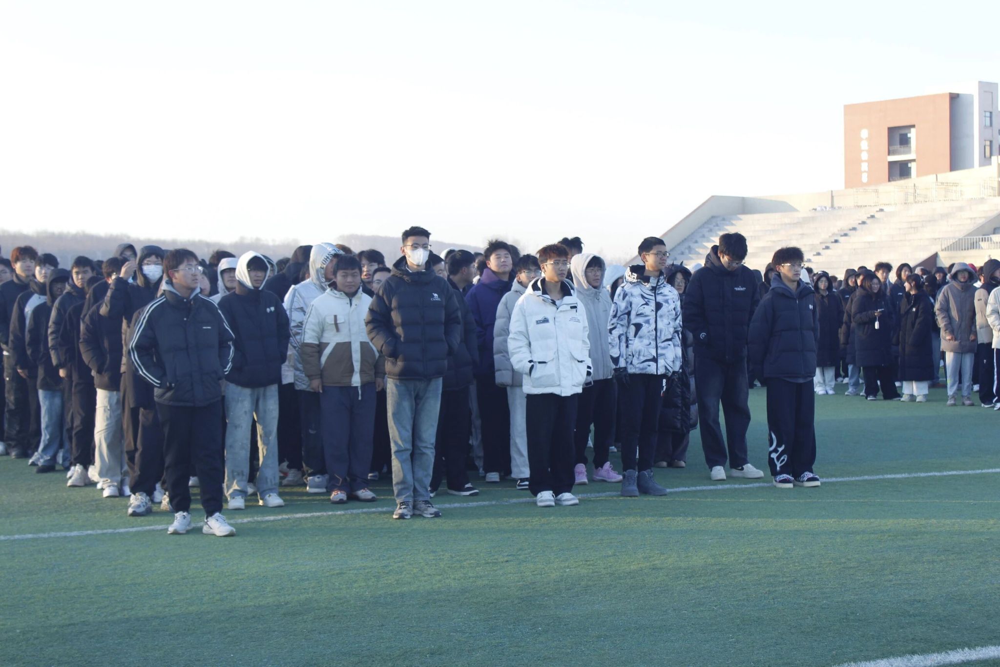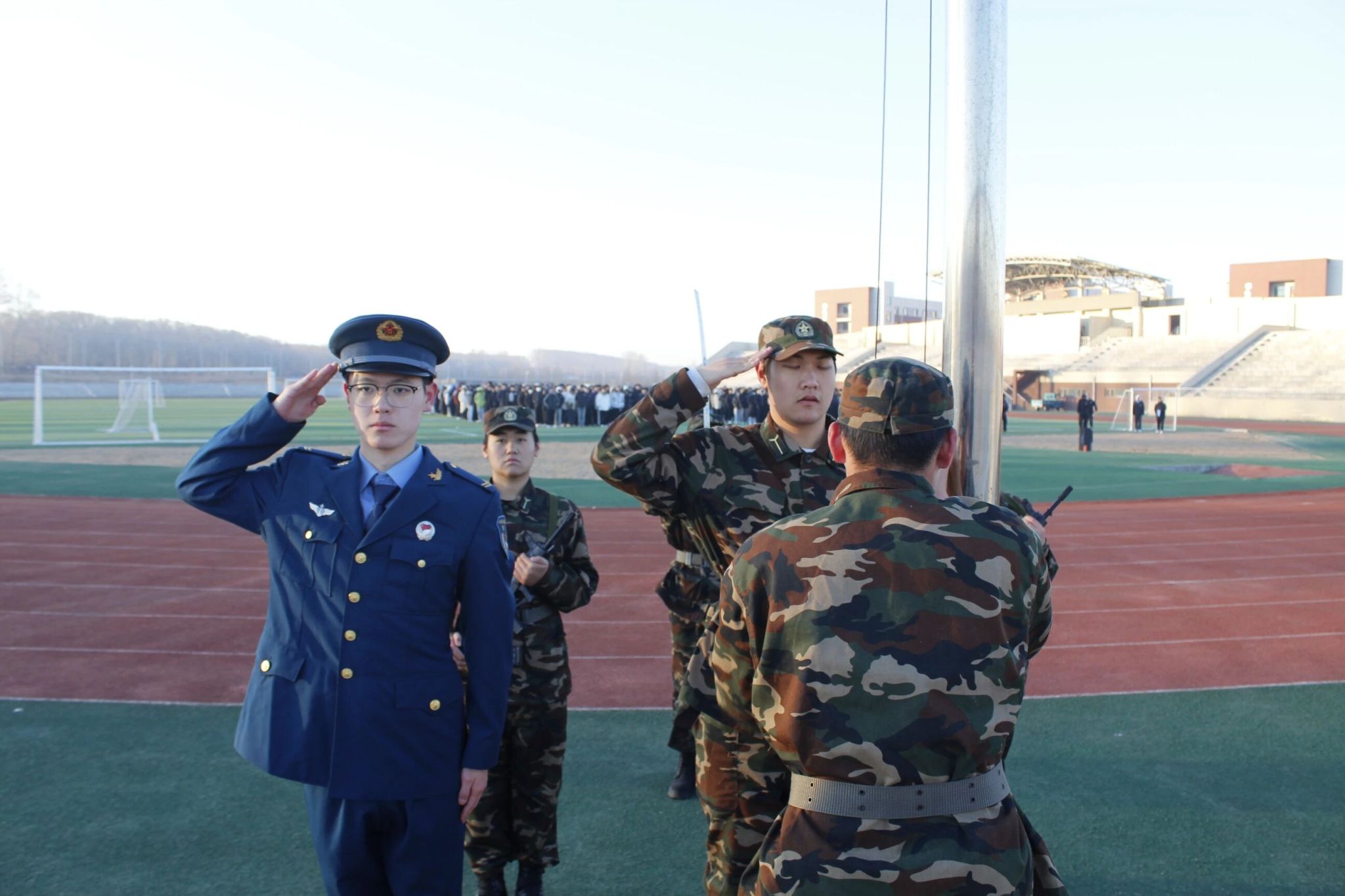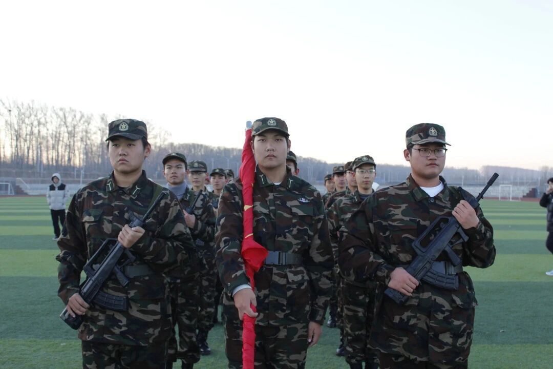 晨光初绽,学院国旗护卫队迈着铿锵有力的步伐护送国旗入场,挺拔身姿迎着朝阳与寒风,坚定眼神里满是对国旗的崇高敬意,整齐的脚步声在晨光中回响,尽显青春担当。