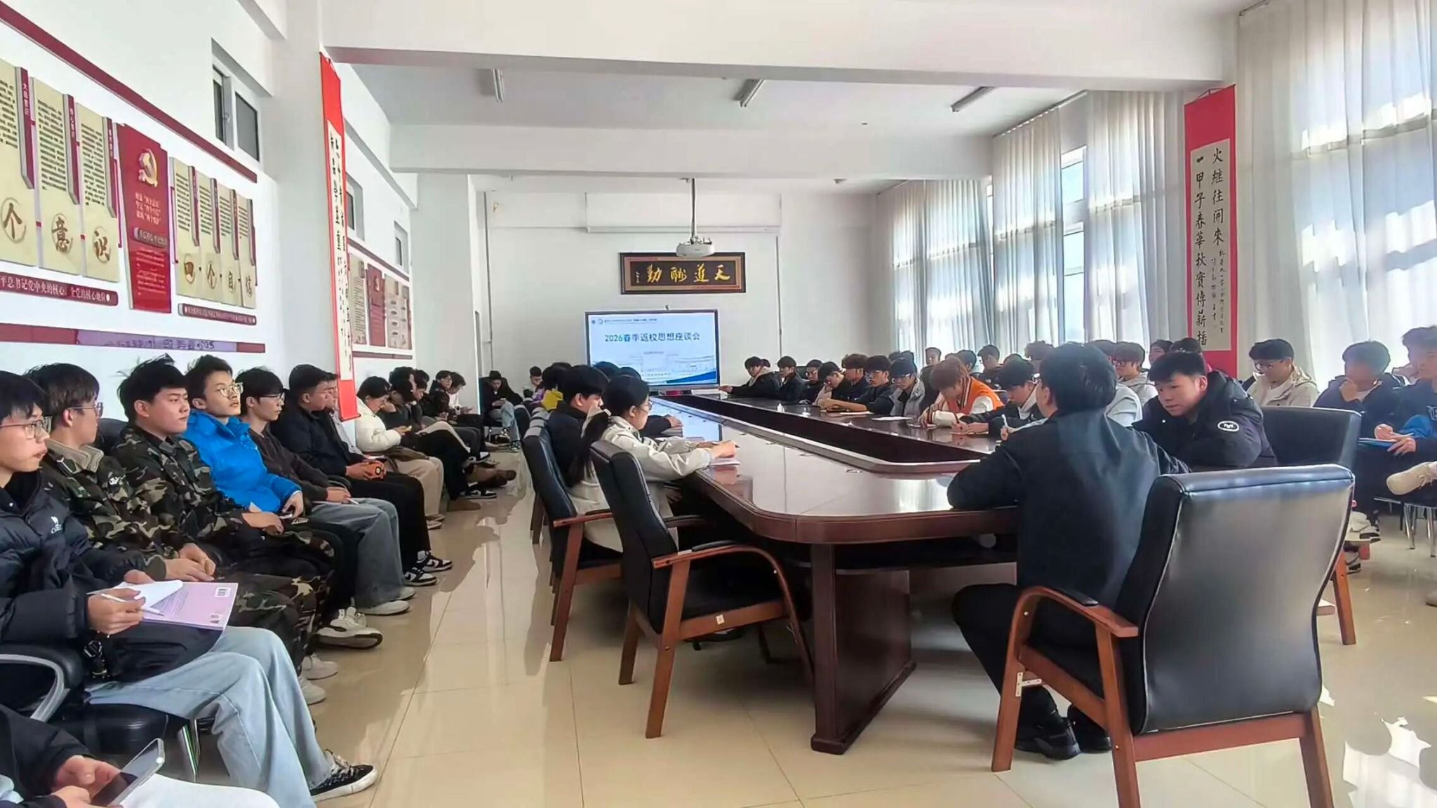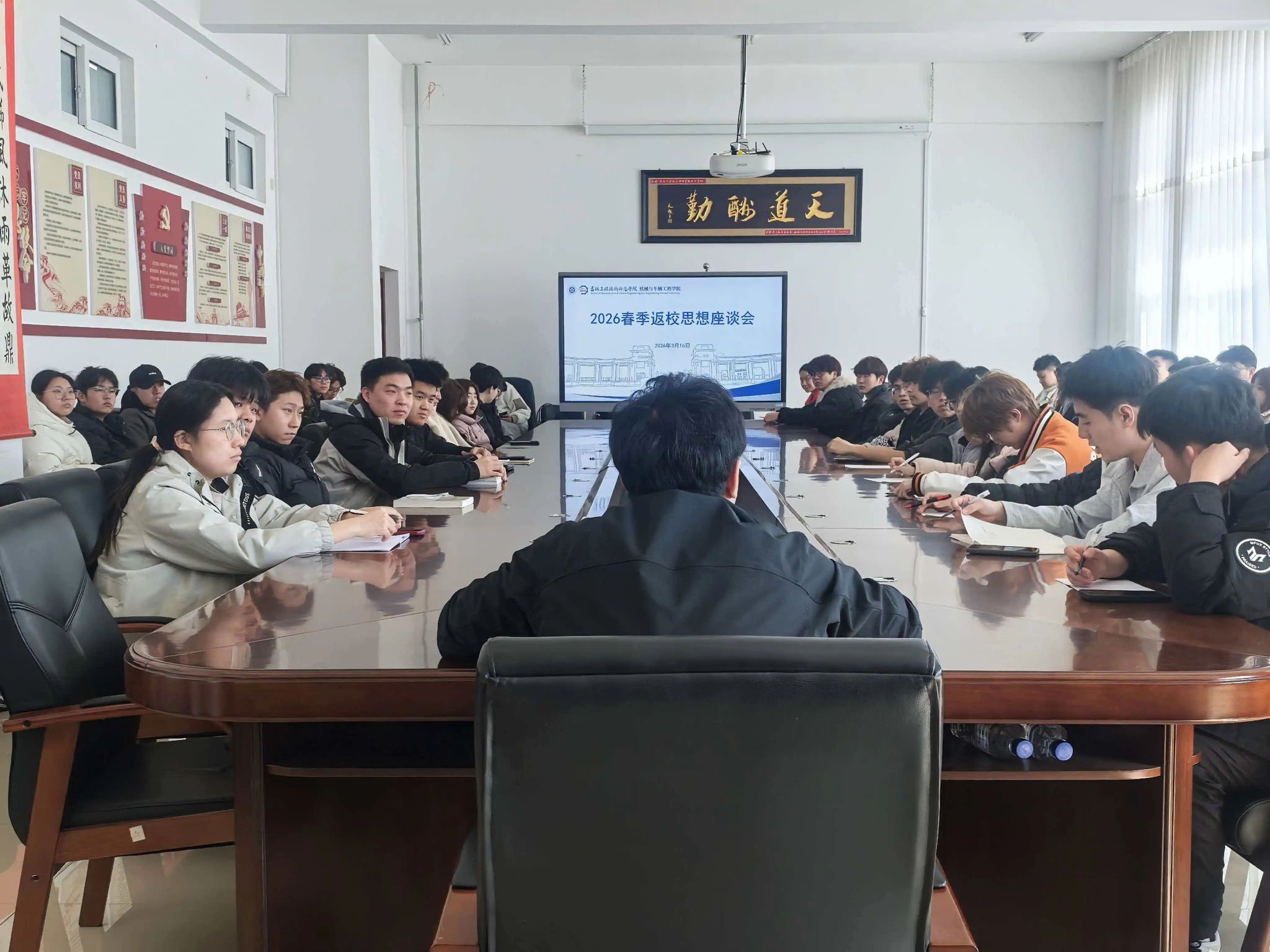 3月16日,为精准研判学生学习生活所需,解决实际问题,帮助青年学子更好适应校园生活,机械与车辆工程学院于机械楼405开展2026年春季学期返校思想动态座谈会。学院团委书记许奇及各班学生代表参会,围绕学子思想动态与成长需求展开交流,会议为新学期思政工作谋篇布局、夯实根基。